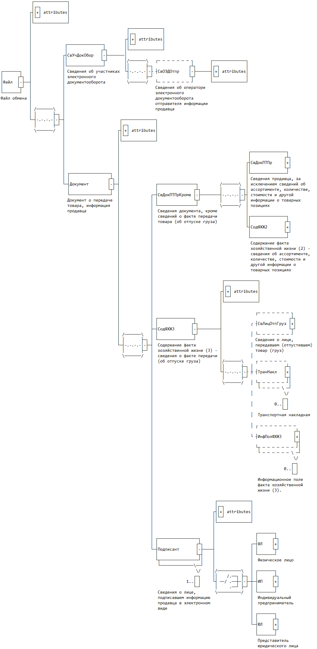 | Идентификация документа о передаче товара, информация продавца | ИдДокПТПр | С | | О | Состав элемента представлен в таблице 7.5 |