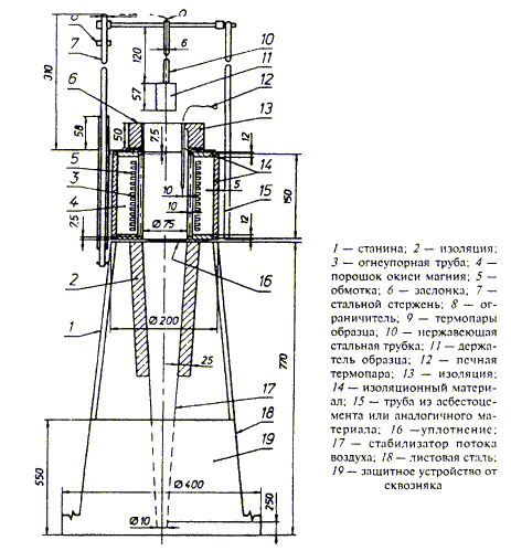 6.3.2. Установка для испытаний (рисунок А1) состоит из печи, помещенной в теплоизолирующую среду; конусообразного стабилизатора воздушного потока; защитного экрана, обеспечивающего тягу; держателя образца и устройства для введения держателя образца в печь; станины, на которой монтируется печь.