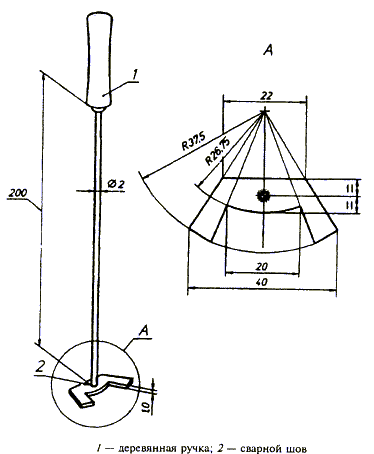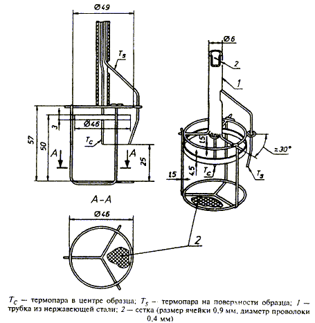 6.3.11. Держатель образца (рисунок A3) изготавливают из нихромовой или жаропрочной стальной проволоки. Основанием держателя является тонкая сетка из жаропрочной стали. Масса держателя должна составлять (15+-2) г. Конструкция держателя образца должна обеспечивать возможность его свободного подвешивания к нижней части трубки из нержавеющей стали наружным диаметром 6 мм с просверленным в ней отверстием диаметром 4 мм.