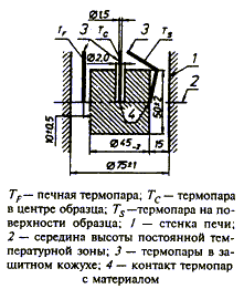 6.5.5. Включить секундомер сразу же после введения образца в печь. В течение испытания вести регистрацию показаний термопар в печи, в центре и на поверхности образца.