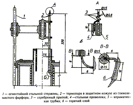 6.3.15. Печную термопару следует устанавливать так, чтобы ее горячий спай находился на середине высоты трубчатой печи на расстоянии (10+-0,5) мм от ее стенки. Для установки термопары в указанном положении используют направляющий стержень (рисунок А4). Фиксированное положение термопары обеспечивается размещением ее в направляющей трубке, прикрепленной к защитному экрану.