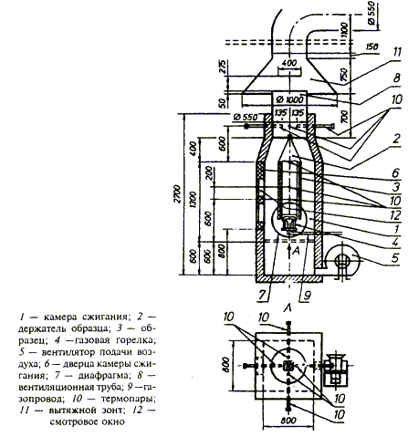 7.3.3. В камере сжигания устанавливают держатель образцов, источник зажигания, диафрагму. Переднюю стенку камеры сжигания оборудуют дверцей с остекленными проемами. В центре боковой стенки камеры следует предусматривать отверстие с заглушкой для введения термопар.