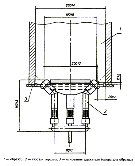 7.3.5. Источником зажигания является газовая горелка, состоящая из четырех отдельных сегментов. Смешение газа с воздухом осуществляется с помощью отверстий, расположенных на газоподводящих трубах при входе в сегмент. Расположение сегментов горелки относительно образца и ее принципиальная схема показаны на рисунке Б2.