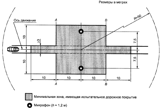При проектировании испытательной площадки важно обеспечить, чтобы, по крайней мере, зона, пересекаемая транспортными средствами, движущимися по испытательному участку, имела оговоренное покрытие и надлежащий запас по ширине для обеспечения безопасности и удобства вождения. Ширина площадки должна быть не менее 3 м, по длине она должна выходить за линии АА и ВВ не менее чем на 10 м с каждой стороны. На рисунке И.1 приведен план испытательной площадки и показана минимальная зона, которая должна иметь покрытие из испытательного материала, уложенное и укатанное механизированным способом. В соответствии с Г.3.1.1.1 измерения должны проводиться с каждой стороны ТС. Они могут проводиться либо в двух точках расположения микрофонов (по одной с каждой стороны площадки) при движении ТС в одном направлении либо при помощи микрофона, расположенного лишь с одной стороны площадки, но с последовательным движением транспортного средства в обоих направлениях. Если используют первый метод, то к покрытию той стороны площадки, где не устанавливается микрофон, никаких требований не предъявляют.
