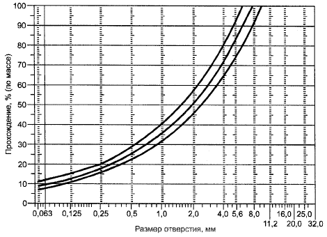 Рисунок И.2 - Гранулометрическая кривая, отражающая состав скелетного материала асфальтобетонной смеси, с допусками