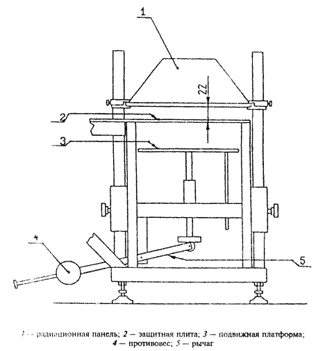 7.3.2. Радиационную панель устанавливают на вертикальных направляющих опорной станины. При этом расстояние от нижней кромки радиационной панели до верхней плоскости защитной плиты должно составлять 22 +- 1 мм.