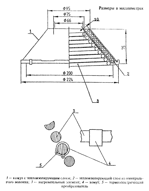 7.3.5. На поверхности нагревательного элемента в двух диаметрально противоположных точках устанавливают два термоэлектрических преобразователя. Каждый из них прикрепляют к витку нагревательного элемента на расстоянии от 1/3 до 1/2 высоты кожуха радиационной панели от ее верхней кромки.