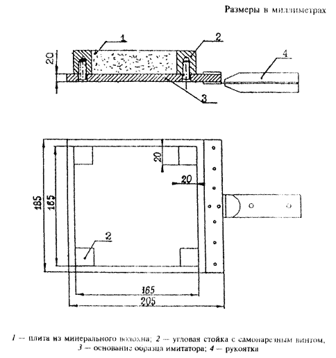7.5.3. Образец-имитатор изготавливают из негорючего минераловолокнистого материала плотностью 200 +- 50 кг/м3 (рисунок A11). Держатель образца-имитатора изготавливают из негорючего материала плотностью 825 +- 125 кг/м3.
