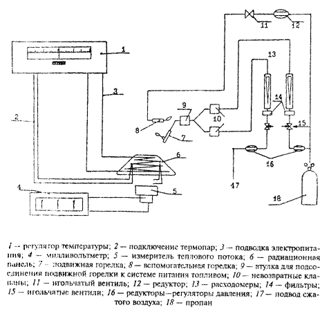 7.1.2. В состав вспомогательного оборудования входят: держатель образца, экранирующая пластина, держатель с образцом-имитатором, система регулирования расхода газовоздушной смеси, регулирующий и регистрирующие приборы, измеритель теплового потока, регистратор времени.