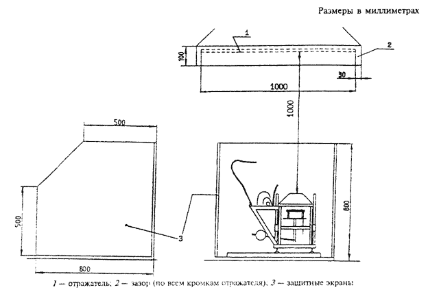 7.5.8. Место размещения установки оборудуют защитными экранами и вытяжной вентиляцией (рисунок А13). В вытяжном зонте устанавливают отражатель воздушного потока, обеспечивающий в зазорах скорость воздуха от 2 до 3 м/с при расходе воздуха от 0,25 до 0,35 м3/с.