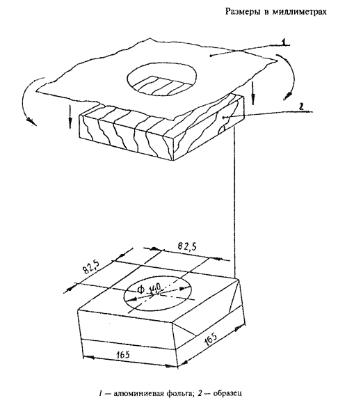 9.1. Образец для испытания, кондиционированный в соответствии с 6.7, оборачивают листом алюминиевой фольги (номинальная толщина 0,2 мм), в центре которого вырезано отверстие диаметром 140 мм. При этом центр отверстия в фольге должен совпадать с центром экспонируемой поверхности образца (рисунок А14).