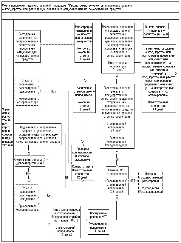 1) рассмотрение документов и принятие решения о государственной регистрации предельных отпускных цен производителей на лекарственные средства. Основание - Постановление Правительства Российской Федерации от 9 ноября 2001 г. N 782 "О государственном регулировании цен на лекарственные средства" и п. 5.5.1 Постановления Правительства Российской Федерации от 30 июня 2004 г. N 323 "Об утверждении Положения о Федеральной службе по надзору в сфере здравоохранения и социального развития";