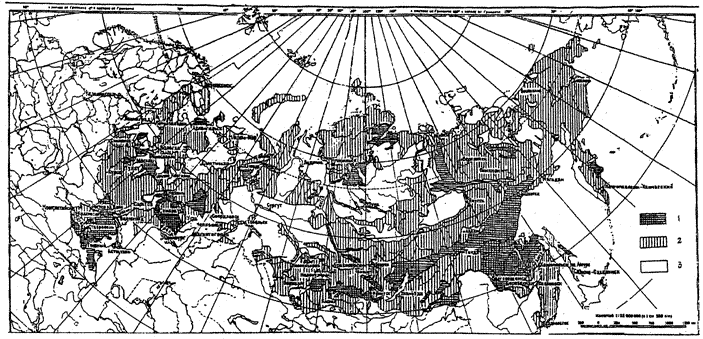 КАРТА-СХЕМА РАЙОНИРОВАНИЯ РСФСР ПО СТЕПЕНИ ОПАСНОСТИ РАЗВИТИЯ ЭКЗОГЕННЫХ ГЕОЛОГИЧЕСКИХ ПРОЦЕССОВ ПРИ ХОЗЯЙСТВЕННОМ ОСВОЕНИИ ТЕРРИТОРИИ И СТРОИТЕЛЬСТВЕ