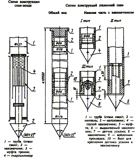 5.3 Схемы конструкций и размеры эталонной сваи и сваи-зонда приведены в приложении Г. Эталонная свая и свая-зонд состоят из отдельных звеньев цельнотянутых металлических труб длиной не менее 1 м. Общая длина эталонной сваи - до 12 м, сваи-зонда - до 16 м. На звенья эталонной сваи и сваи-зонда наносят деления через 10 см для отсчета глубины погружения сваи.