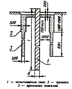 При длине свай более 6 м со дна траншеи для ускорения замачивания грунта следует бурить дренажные скважины в количестве не менее трех с расположением их на равных расстояниях от оси сваи. Диаметр скважин принимают не менее 20 см, длину - 0,8 l, где l - глубина погружения сваи. Скважины и траншеи сразу после их проходки следует засыпать гравием или щебнем. Во время замачивания грунта и в процессе испытания в траншее следует поддерживать постоянный уровень воды, слой которой должен быть не менее высоты засыпки.