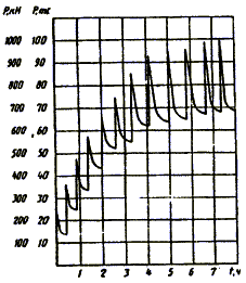 2 Нагружение испытываемой сваи производят (рис.1) быстро, без ударов ступенями нагрузки, значение которых принимают равным 1/8 от предельно длительного сопротивления сваи статической вдавливающей нагрузке, полученного по результатам испытаний, или от полуторного значения несущей способности, сваи по грунту, определенной расчетом по указаниям СНиП 2.02.04. Каждую ступень нагружения выдерживают в течение 4 ч, за которые нагрузка снижается по динамометрическому закону вследствие развития осадки.