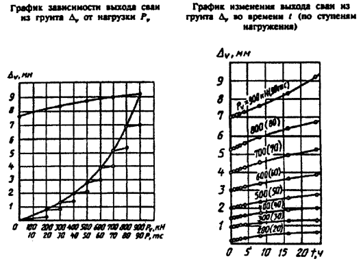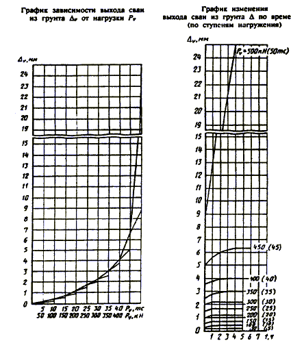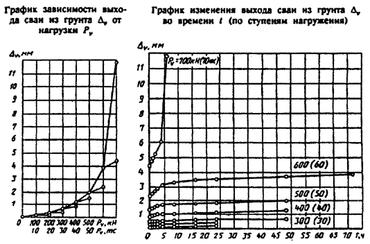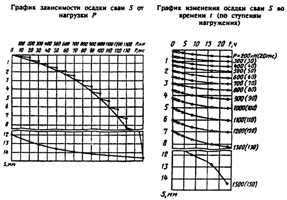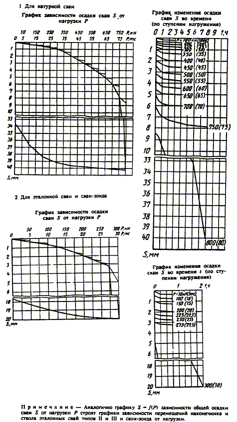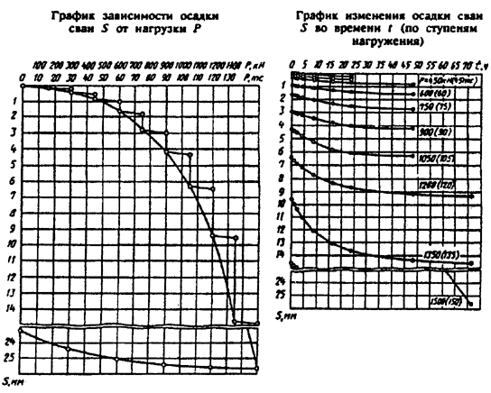 7 Результаты испытаний грунтов оформляют в виде графиков зависимости осадки сваи от нагрузки и изменения нагрузки во времени по ступеням осадки.