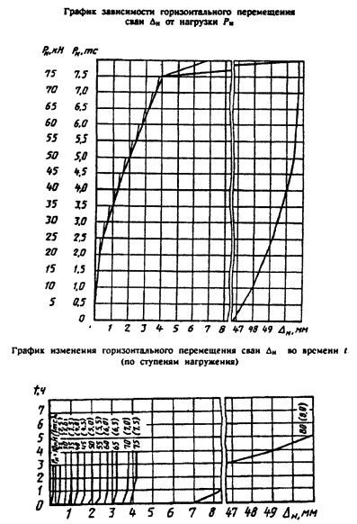 4.9 В процессе проведения испытаний грунтов сваями всех типов следует вести журналы испытаний, а результаты испытаний оформлять в виде графиков зависимостей перемещений сваи от нагрузки, приложенной к свае для испытаний статическими нагрузками, или графиков изменения отказов и зависимости общего количества ударов от глубины погружения - для испытаний динамическими нагрузками.