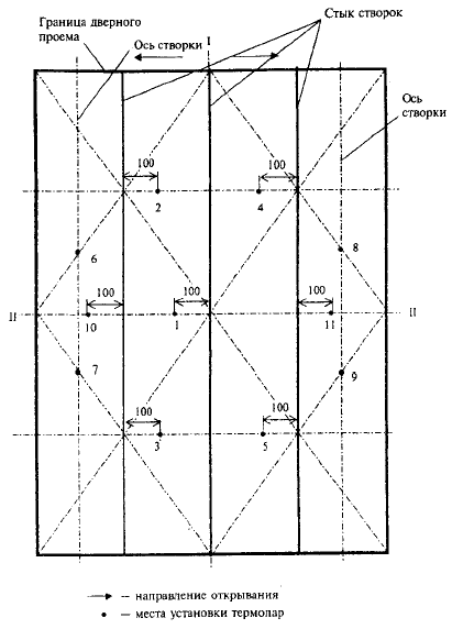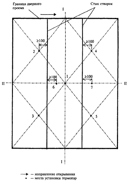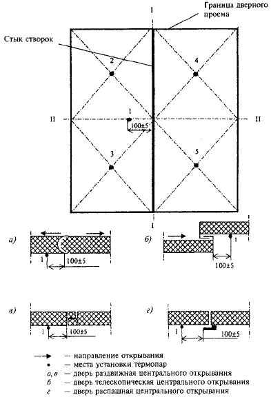 10.7 Для измерения температуры на необогреваемой поверхности образца двери с теплоизоляцией должны быть установлены термоэлектрические преобразователи (далее - термопары). Схемы установки термопар на образцах различных типов дверей приведены в приложении А.