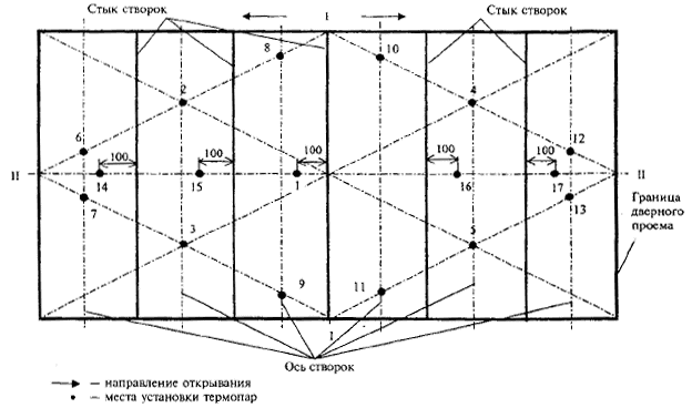 - на пересечении диагоналей каждой четверти площади дверного проема с вертикальными осями каждой из створок за исключением створок, на которые установлены термопары 2-5 (рисунок А.4 - термопары 6-9, рисунок А.5 - термопары 6 - 13, рисунок А.6 - термопары 6-17);