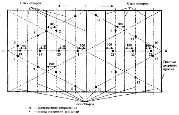 - на каждой из створок по горизонтальной оси II-II, в 100±5 мм от торцевой поверхности предыдущей створки, в сторону ее движения при открывании (рисунок А.3 - термопары 6, 7, рисунок А.4 - термопары 10, 11, рисунок А.5 - термопары 14 - 17, рисунок А.6 - термопары 18-23);
