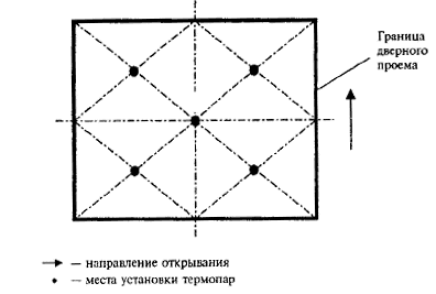 Рисунок А.9 - Схема установки термопар на необогреваемой поверхности площади, образуемой границей строительного и дверного проемов