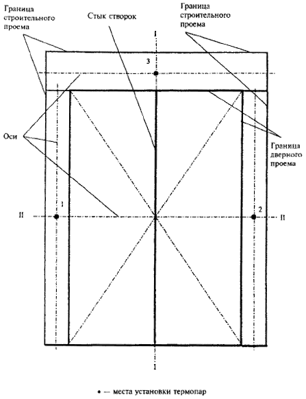 - в центре светопрозрачного заполнения и в середине верхней части его обрамления (при наличии светопрозрачного заполнения) (рисунок А.1 - термопары 6 и 7).
