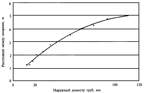 3.5.1 Выбор приближенных значений расстояний между креплениями трубопроводов из твердых медных труб следует осуществлять по графику (рисунок 1). Расстояние между креплениями горизонтальных трубопроводов из полутвердых и мягких труб необходимо принимать меньше на 10 и 20% соответственно. Более точные значения расстояний между креплениями на горизонтальных трубопроводах следует определять расчетом (приложение Г).