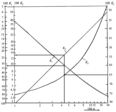 Рисунок Г.1 - Графики для определения коэффициентов K_1, K_2 и K_3 в зависимости от n (отношения толщины стенки к наружному диаметру трубы)