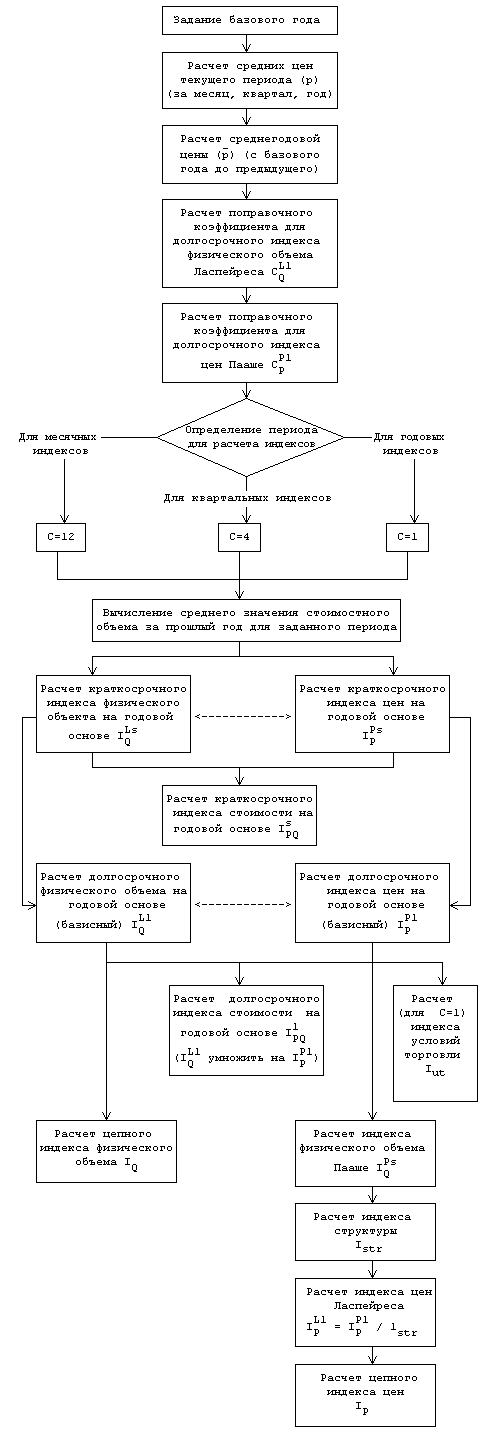 Алгоритм расчета включает две составляющие. Первая из них, именуемая непосредственно алгоритмом расчета, отражает последовательность расчета индексов различных видов в соответствии с методом годового перекрытия. Она представлена на рисунке 1. Вторая составляющая, представленная на рисунке 2, для каждого вида индексов отражает расчет сводных индексов.