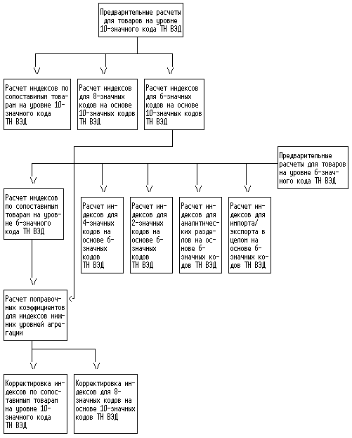 1. Определяются индексы физического объема и цен на уровне 10-значных, 8-значных и 6-значных кодов по отобранному списку товаров для импорта и экспорта соответственно на низшей классификационной группе товаров (10-значного кода ТН ВЭД России);