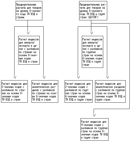 5. Рассчитываются индексы на уровне 2-значных кодов, аналитических разделов и импорта и экспорта в целом по отобранному списку товаров для импорта и экспорта соответственно с разбивкой по всем странам, по странам из представленного перечня и с разбивкой на СНГ и дальнее зарубежье.
