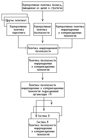 Там, где это целесообразно, корпоративная политика безопасности информационных и коммуникационных технологий может быть включена в спектр политик - технических политик и политик менеджмента, которые все вместе образуют базис для корпоративной политики информационных и коммуникационных технологий. Эта политика должна включать некоторые убедительные слова о важности безопасности, особенно если безопасность необходима для согласования с этой политикой. На рисунке 2 показан пример возможного иерархического отношения политик. Независимо от документации и организационной структуры важно, чтобы учитывались различные положения описанных политик и поддерживалась согласованность между ними.