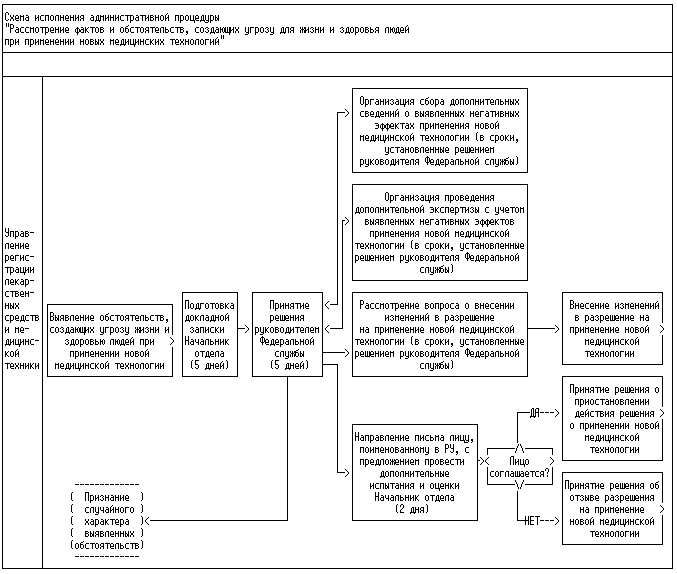 В том случае, если причиной возникновения подобных обстоятельств являются особенности действия используемых в новой медицинской технологии лекарственных средств или изделий медицинского назначения, Федеральная служба по надзору в сфере здравоохранения и социального развития в дополнение к настоящей административной процедуре должна выполнить соответствующие административные процедуры регламентов Федеральной службы по надзору в сфере здравоохранения и социального развития по исполнению государственных функций по государственной регистрации лекарственных средств или по регистрации изделий медицинского назначения, соответственно.