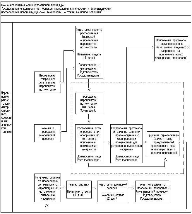 3.6. Административная процедура "Осуществление контроля за порядком проведения клинических и биомедицинских исследований новой медицинской технологии, а также ее использованием" исполняется в ходе плановых и внеплановых мероприятий по контролю за деятельностью организаций разработчиков и авторов новой медицинской технологии, а также лиц, поименованных в разрешении на применение новой медицинской технологии в соответствии с нижеследующим порядком (схема осуществления административной процедуры приведена в Приложении 6):