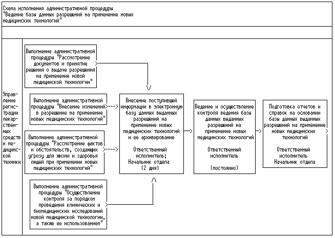 3.7. Административная процедура "Ведение базы данных выданных разрешений на применение новых медицинских технологий" осуществляется в связи с выполнением административных процедур "Рассмотрение документов и принятие решения о выдаче разрешения на применение новой медицинской технологии", "Внесение изменений в разрешение на применение новой медицинской технологии", "Рассмотрение фактов и обстоятельств, создающих угрозу для жизни и здоровья людей при применении разрешенных новых медицинских технологий" и "Осуществление контроля за порядком проведения клинических и биомедицинских исследований новой медицинской технологии, а также ее использованием" настоящего Регламента в соответствии с нижеследующим порядком (схема осуществления административной процедуры приведена в Приложении 7):