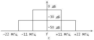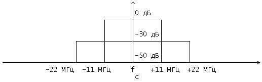 2. Для оборудования радиодоступа для БПД, работающего в диапазонах частот 2300 - 2500 МГц со скоростью передачи данных по радиоканалу 1, 2, 5,5, 6, 9, 11, 22 Мбит/с, маска спектра приведена на рисунке 1.