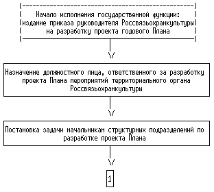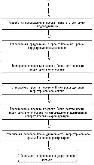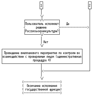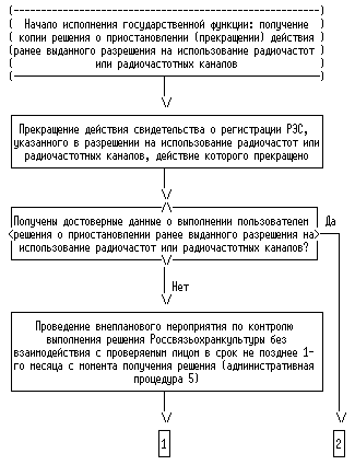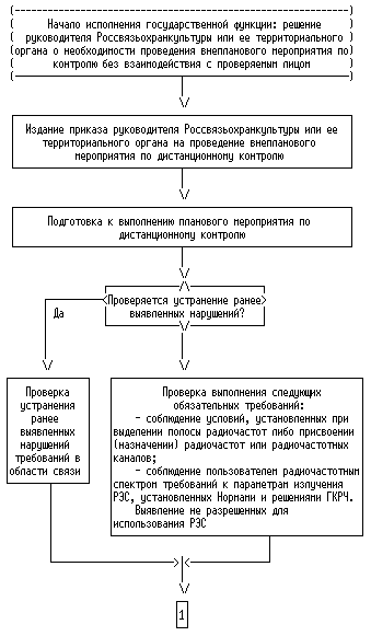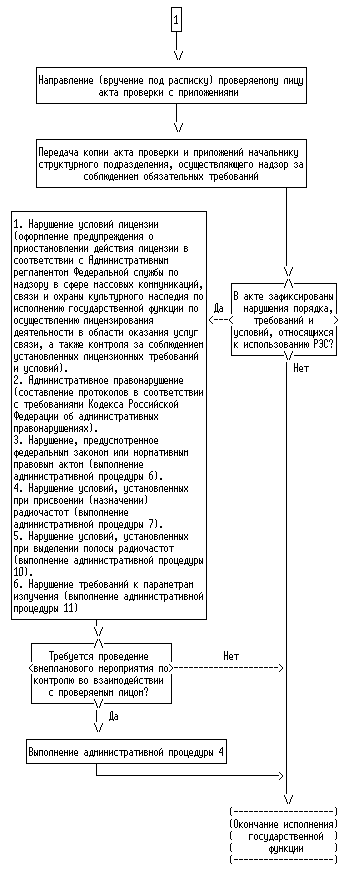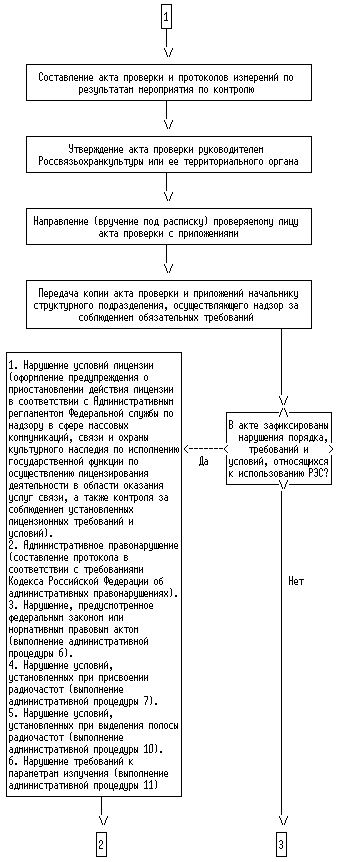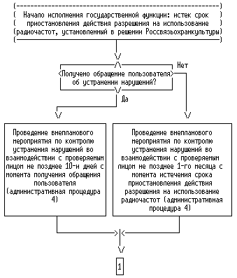 Продолжение блок-схемы последовательности действий при исполнении административной процедуры 1 "Планирование мероприятий по контролю за соблюдением пользователями радиочастотным спектром порядка, требований и условий, относящихся к использованию РЭС или ВЧУ"