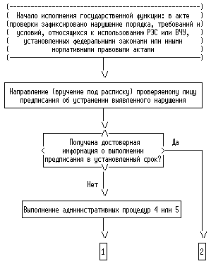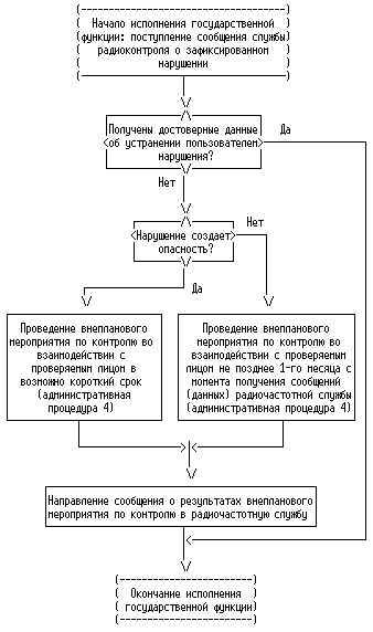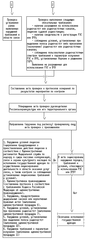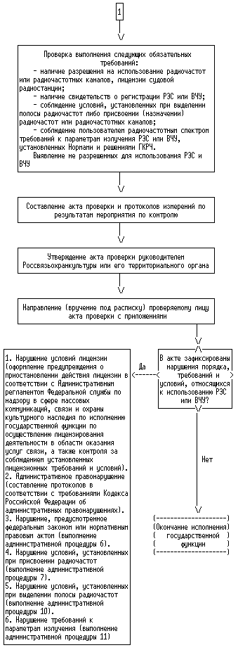 4. Исполнение Россвязьохранкультурой и (или) ее территориальными органами государственной функции по осуществлению государственного надзора и контроля за соблюдением пользователями радиочастотным спектром порядка, требований и условий, относящихся к использованию РЭС или ВЧУ, включая надзор с учетом сообщений (данных), полученных в процессе проведения радиочастотной службой радиоконтроля, включает в себя выполнение следующих административных процедур:
