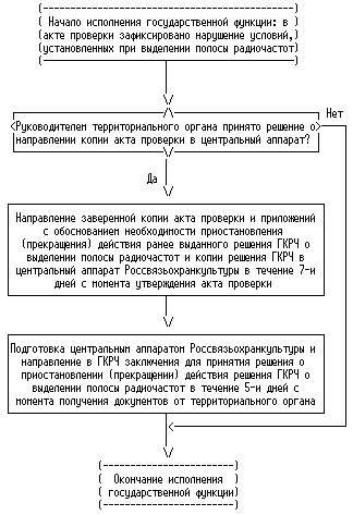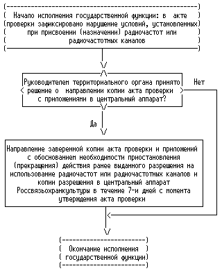 Продолжение блок-схемы последовательности действий при исполнении административной процедуры 8 "Действия территориального органа Россвязьохранкультуры при получении решения о приостановлении (прекращении) действия ранее выданного пользователю радиочастотным спектром разрешения на использование радиочастот"
