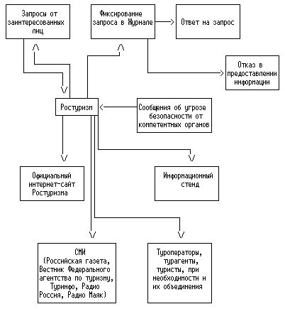 в течение 24 часов с момента поступления в пресс-службу Ростуризма информации об угрозе безопасности довести ее до заинтересованных лиц, при необходимости и их объединений, путем распространения ее через печатные средства массовой информации ("Российская газета", "Вестник Федерального агентства по туризму", информационное агентство "Туринфо"), через аудиовизуальные (Радио Россия, Радио Маяк), разместить на сайте Ростуризма, а также на информационных стендах в помещении центрального аппарата Ростуризма.