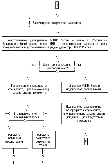 3.8. Основанием для принятия решения о ввозе в Российскую Федерацию и (или) вывозе из нее ПВН является завершение рассмотрения представленных документов, согласования с должностными лицами ФСВТС России проекта распоряжения ФСВТС России о разрешении ввоза в Российскую Федерацию и (или) вывоза из нее ПВН и оформления распоряжения ФСВТС России о ввозе в Российскую Федерацию и (или) вывозе из нее ПВН.