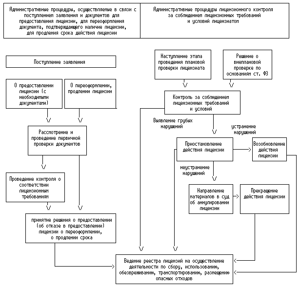 положения законодательства Российской Федерации, регламентирующие порядок лицензирования деятельности по сбору, использованию, обезвреживанию, транспортировке, размещению опасных отходов, а также блок-схемы порядка лицензирования и выполнения административных процедур в рамках лицензирования данной деятельности с указанием ответственных должностных лиц, содержания, последовательности и сроков исполнения административных действий;