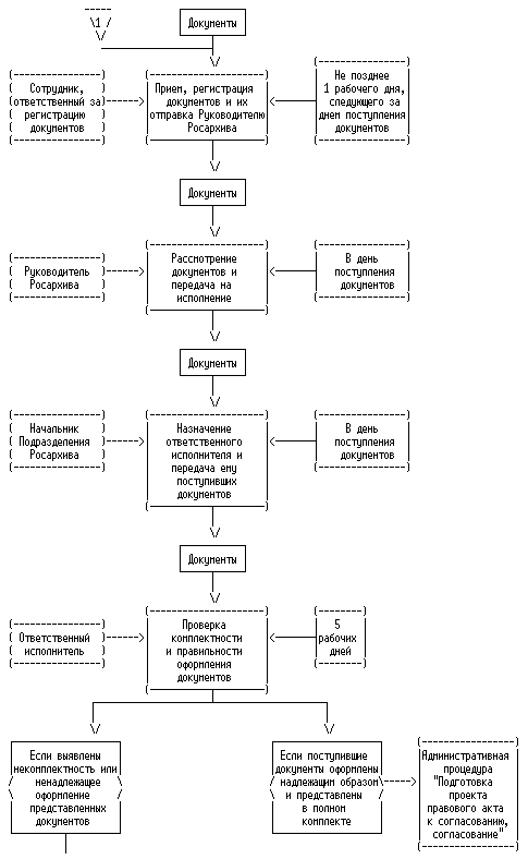 Блок-схема административной процедуры "Прием и регистрация документов, поступивших от федерального органа государственной власти, и передача их на исполнение" - часть 1