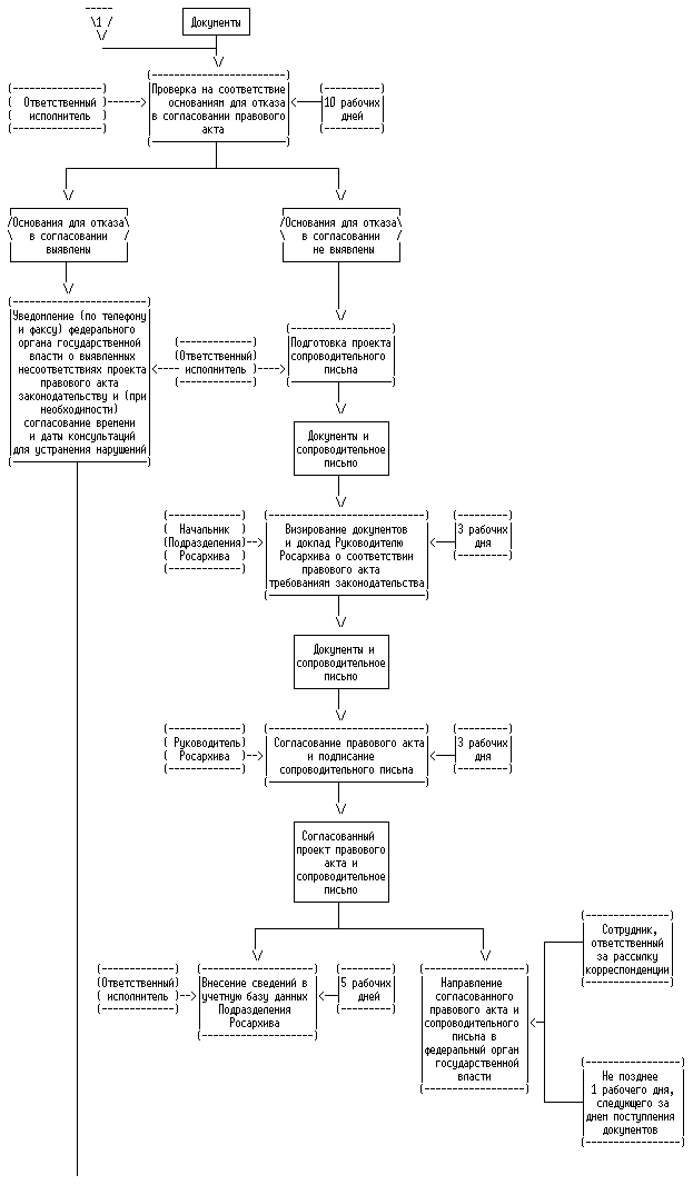20. Если поступившие документы надлежаще оформлены и представлены в полной комплектности, ответственный исполнитель Подразделения Росархива готовит документы к согласованию в соответствии с административной процедурой "Подготовка проекта правового акта к согласованию, согласование".