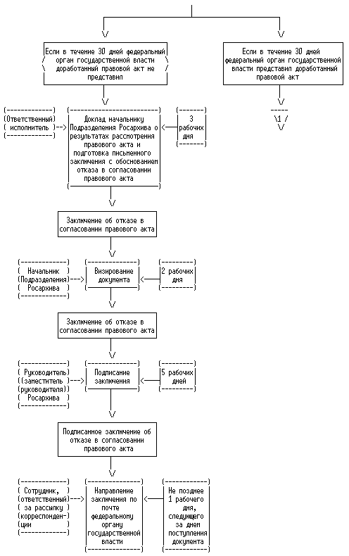 32.1. ответственный исполнитель в течение 3 рабочих дней Подразделения Росархива докладывает начальнику Подразделения Росархива результаты рассмотрения проекта правового акта, готовит письменное заключение с обоснованием отказа в согласовании проекта правового акта, в котором даются ссылки на нормативные правовые акты (пункты, статьи), указываются причины, послужившие основанием для принятия такого решения. Заключение оформляется на бланке письма Росархива и направляется начальнику Подразделения Росархива.