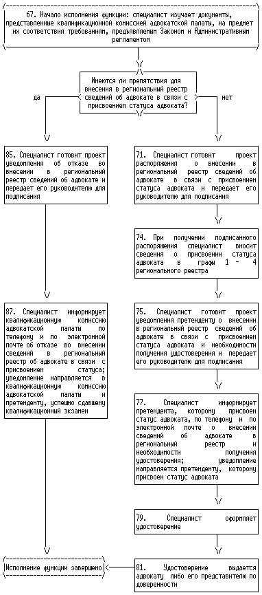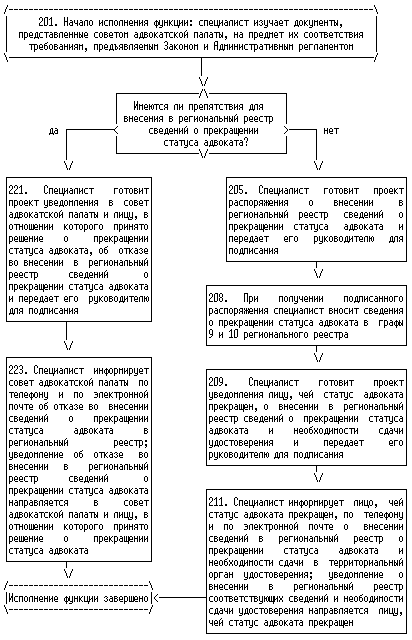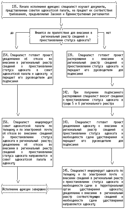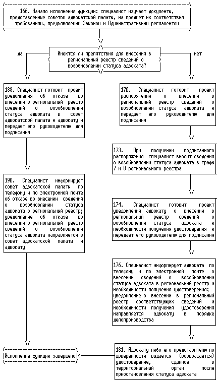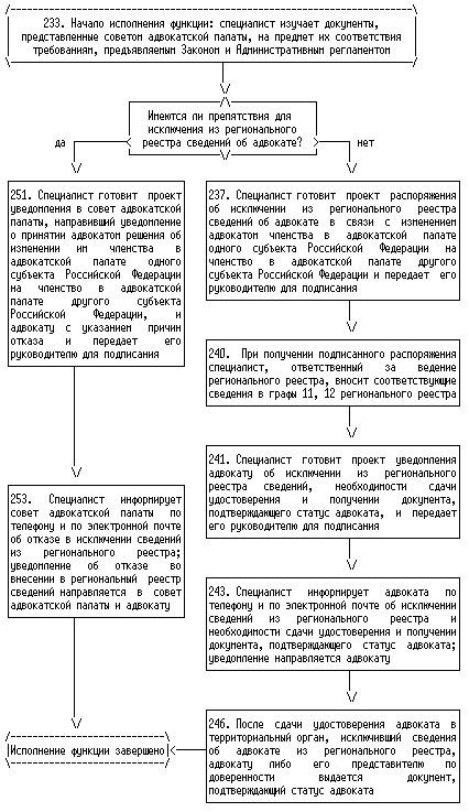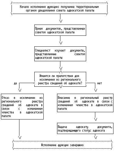 6. Началом исполнения государственной функции по внесению в региональный реестр сведений об адвокатах в связи с присвоением статуса адвоката, изменением адвокатом членства в адвокатской палате одного субъекта Российской Федерации на членство в адвокатской палате другого субъекта Российской Федерации, приостановлением, возобновлением, прекращением статуса адвоката, а также по исключению сведений об адвокате из регионального реестра в связи с изменением им членства в адвокатской палате является получение территориальным органом уведомления органа адвокатской палаты соответствующего субъекта Российской Федерации (далее - адвокатская палата). Окончанием исполнения указанной государственной функции являются внесение соответствующих сведений в региональный реестр или отказ во внесении таких сведений, исключение сведений из регионального реестра или отказ в исключении таких сведений.