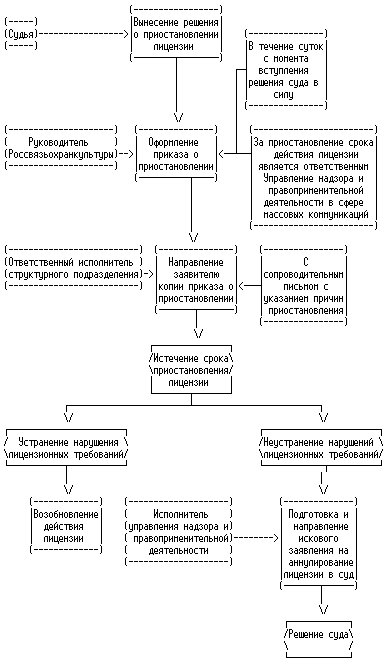 БЛОК-СХЕМА АДМИНИСТРАТИВНОЙ ПРОЦЕДУРЫ "ПРИОСТАНОВЛЕНИЕ ДЕЙСТВИЯ ЛИЦЕНЗИИ НА ОСУЩЕСТВЛЕНИЕ ВОСПРОИЗВЕДЕНИЯ (ИЗГОТОВЛЕНИЯ ЭКЗЕМПЛЯРОВ) АУДИОВИЗУАЛЬНЫХ ПРОИЗВЕДЕНИЙ И ФОНОГРАММ НА ЛЮБЫХ ВИДАХ НОСИТЕЛЕЙ"
