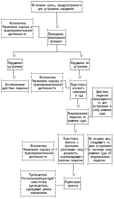 БЛОК-СХЕМА АДМИНИСТРАТИВНОЙ ПРОЦЕДУРЫ "ПОДГОТОВКА ДОКУМЕНТОВ В СУД ДЛЯ АННУЛИРОВАНИЯ ЛИЦЕНЗИИ НА ОСУЩЕСТВЛЕНИЕ ВОСПРОИЗВЕДЕНИЯ (ИЗГОТОВЛЕНИЯ ЭКЗЕМПЛЯРОВ) АУДИОВИЗУАЛЬНЫХ ПРОИЗВЕДЕНИЙ И ФОНОГРАММ НА ЛЮБЫХ ВИДАХ НОСИТЕЛЕЙ"