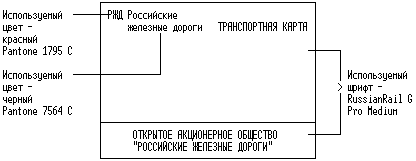 В нижней части транспортной карты расположена надпись, выполненная заглавными печатными буквами корпоративным шрифтом двумя строками: ОТКРЫТОЕ АКЦИОНЕРНОЕ ОБЩЕСТВО "РОССИЙСКИЕ ЖЕЛЕЗНЫЕ ДОРОГИ", причем слова "РОССИЙСКИЕ ЖЕЛЕЗНЫЕ ДОРОГИ" размещены под словами "ОТКРЫТОЕ АКЦИОНЕРНОЕ ОБЩЕСТВО".